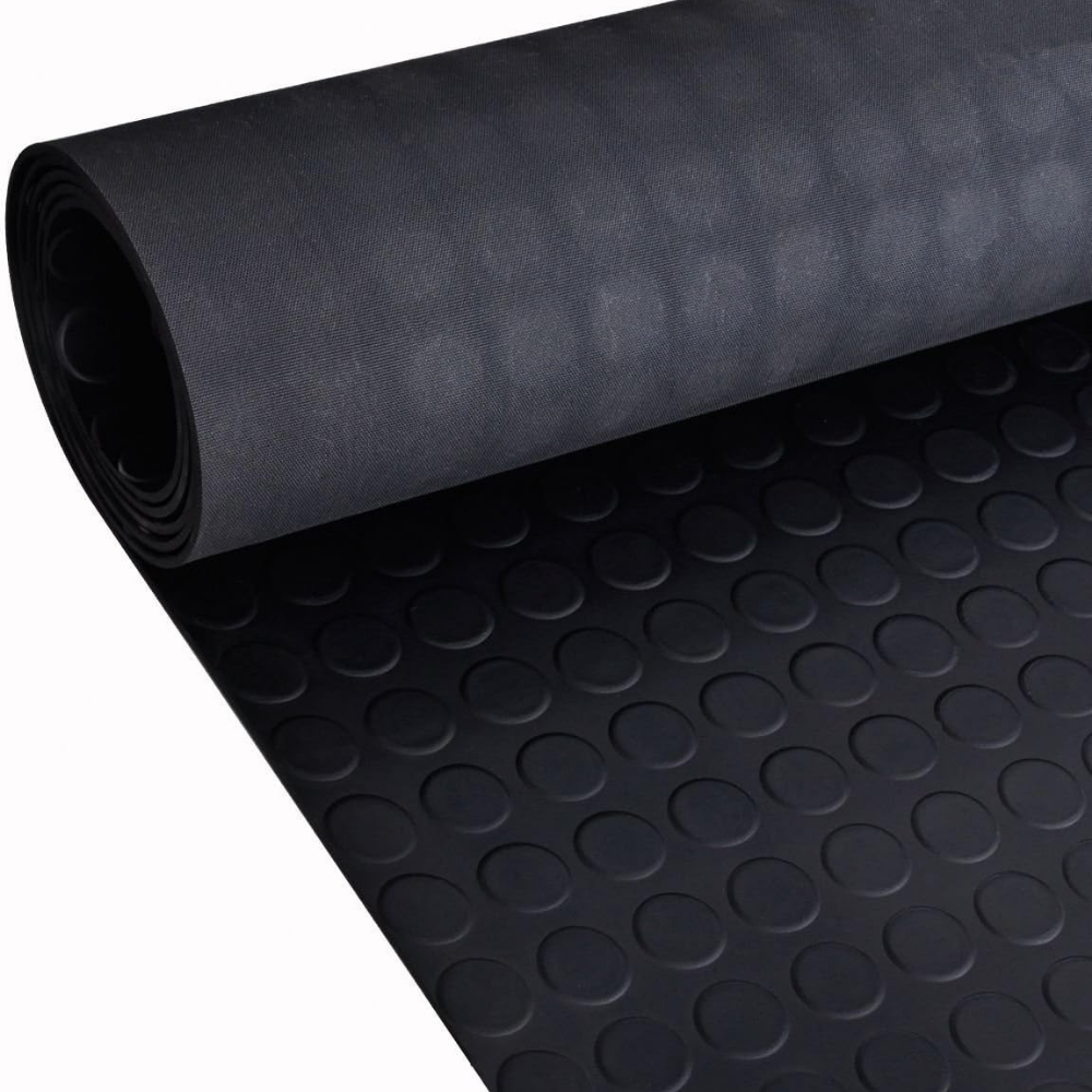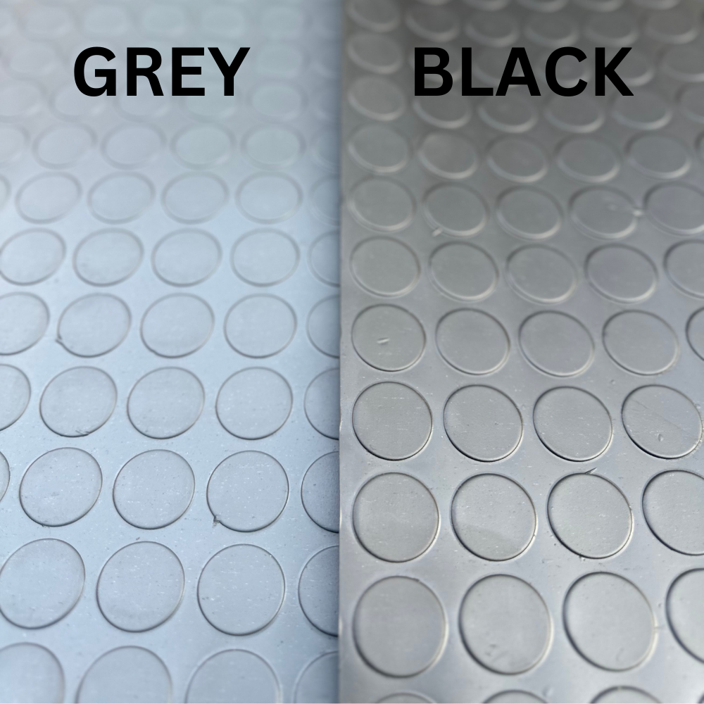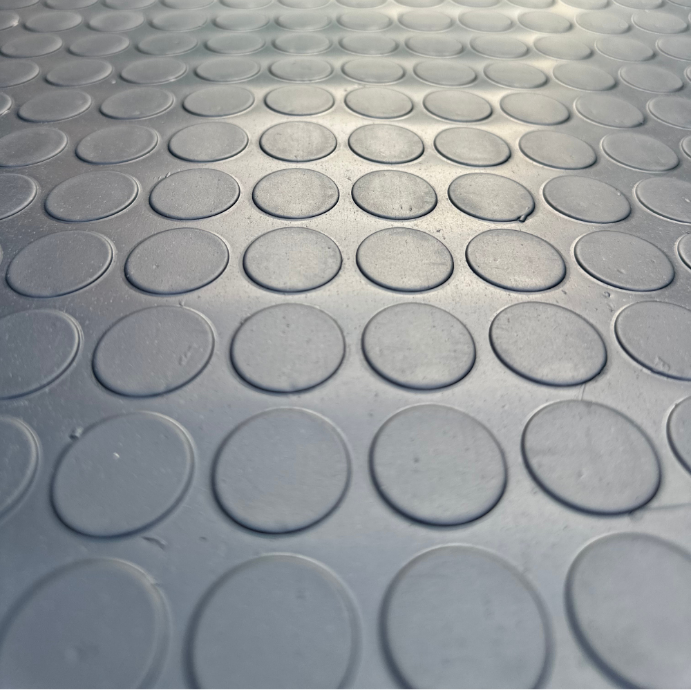 The stud surface pattern is more prone to scraping action and offers added grip for applications where dirt and moisture is prevalent. This ribbed flooring is used where protection and safety are of the utmost importance. For example: construction sites, airports, entryways, indoor aisle ways, but also as industrial shelves, scraper mats, shelf liners, toolbox liners and van flooring.